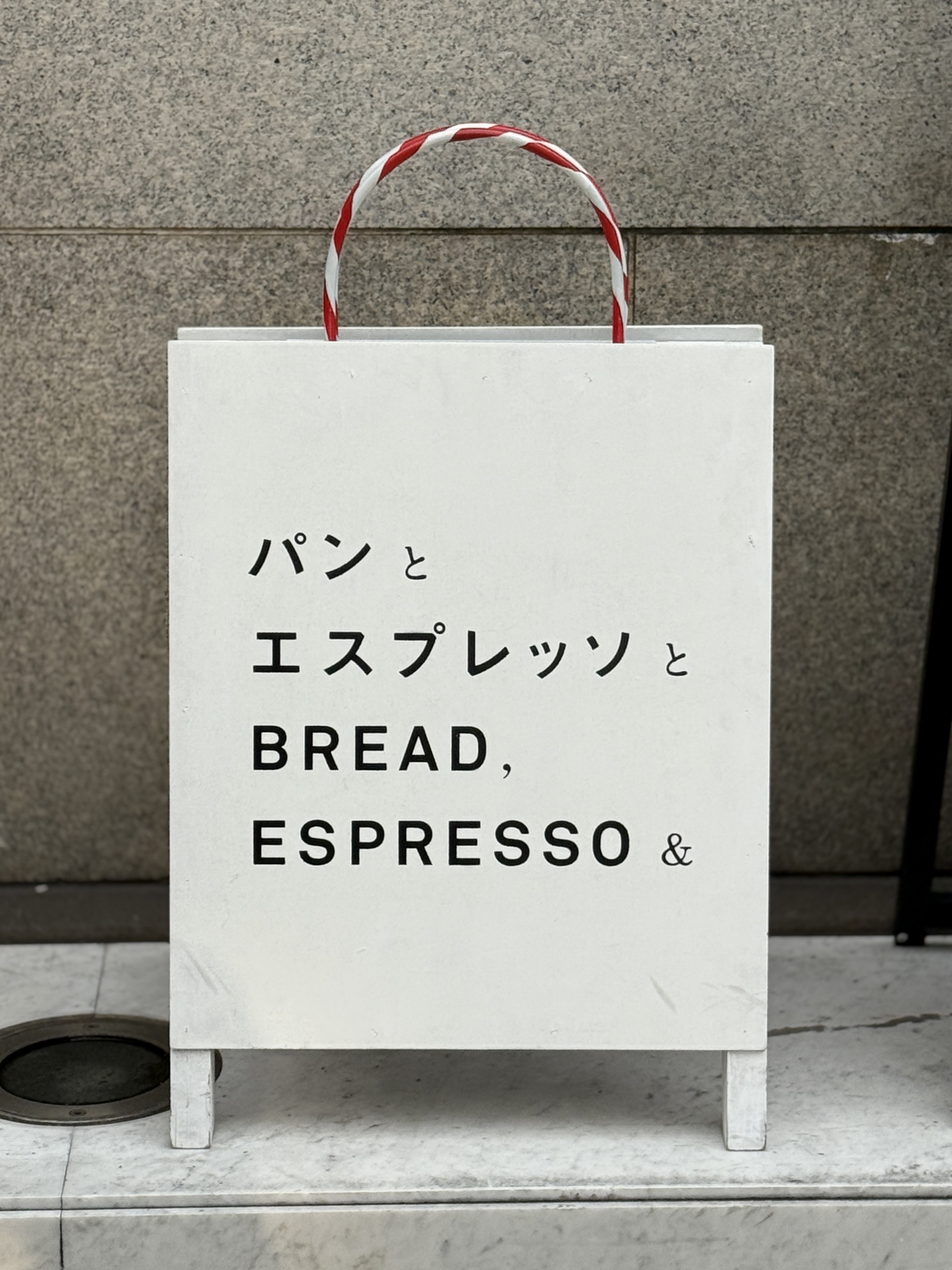 '팡토 에스프레소토(パンとエスプレッソと)' 의 상징과도 같은 쇼핑백 모양의 입간판입니다.